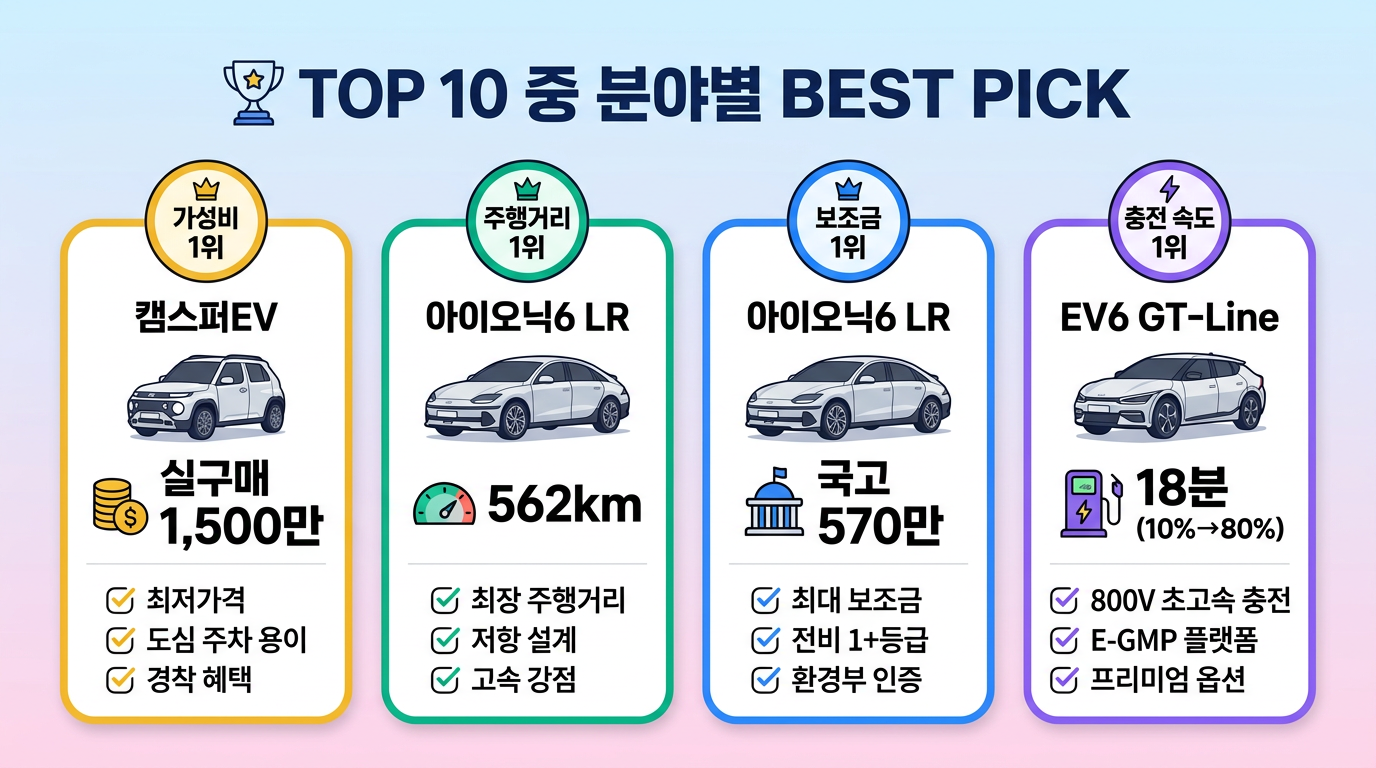 | 장거리 효율 최우선 | 아이오닉6 LR | 562km 최장 거리, 전비 6.8km/kWh, 보조금 570만 원 |