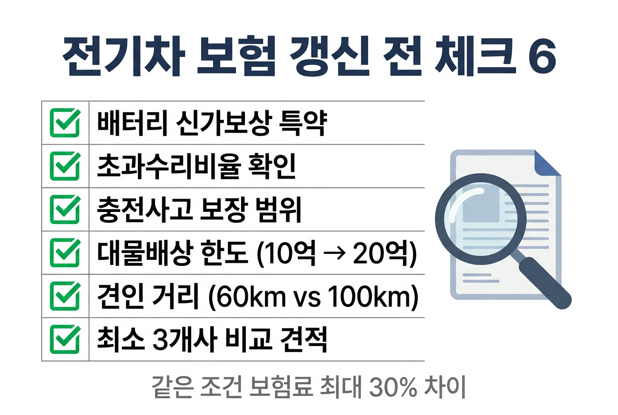 ① 배터리 신가보상 특약 가입 여부. 증권에서 "전기차 배터리 교체비용 전액보상" 또는 "배터리 신가보상" 문구를 확인하세요. ② 초과수리비율 확인. 150 %인지, 130 %인지, 120 %인지에 따라 차주 부담이 수백만 원 달라집니다. ③ 충전사고 보장 범위. 공용 충전소를 자주 쓴다면, 충전설비 하자까지 커버하는지 체크하세요. ④ 대물배상 한도. 최소 10억 원, 가능하면 20억 확대 특약을 검토하세요. ⑤ 견인 거리. 제조사 서비스센터가 먼 지역이라면 100 km 견인 특약이 있는 보험사를 선택하세요. ⑥ 최소 3개사 비교 견적. 같은 조건이라도 보험사별로 최대 30 % 이상 차이가 납니다.