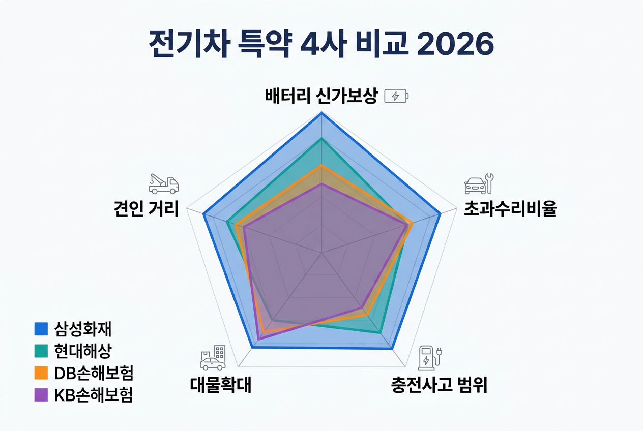 아래 표는 2026년 3월 기준, 시장점유율 상위 4사의 전기차 전용 특약을 5개 핵심 항목으로 비교한 것입니다.