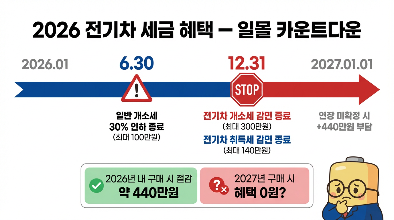 2026년은 전기차 세금 혜택의 '마지막 해'가 될 가능성이 높습니다. 현재 적용 중인 세 가지 핵심 감면이 모두 12월 31일 일몰 예정이기 때문입니다.
