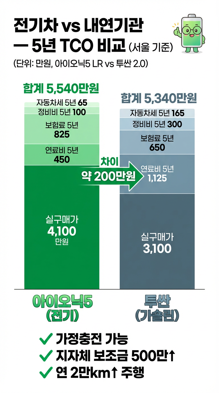 서울 기준 가정충전 환경에서 5년 TCO 차이는 약 200만 원으로, 내연기관이 아직 근소하게 유리합니다. 하지만 지자체 보조금이 큰 지역(경기 외곽, 지방)에서는 실구매가가 3,400~3,600만 원까지 내려가 TCO가 역전됩니다. 반대로 가정충전이 불가능하고 공공 급속만 이용하면 연료비 절감이 줄어 격차가 더 벌어집니다.