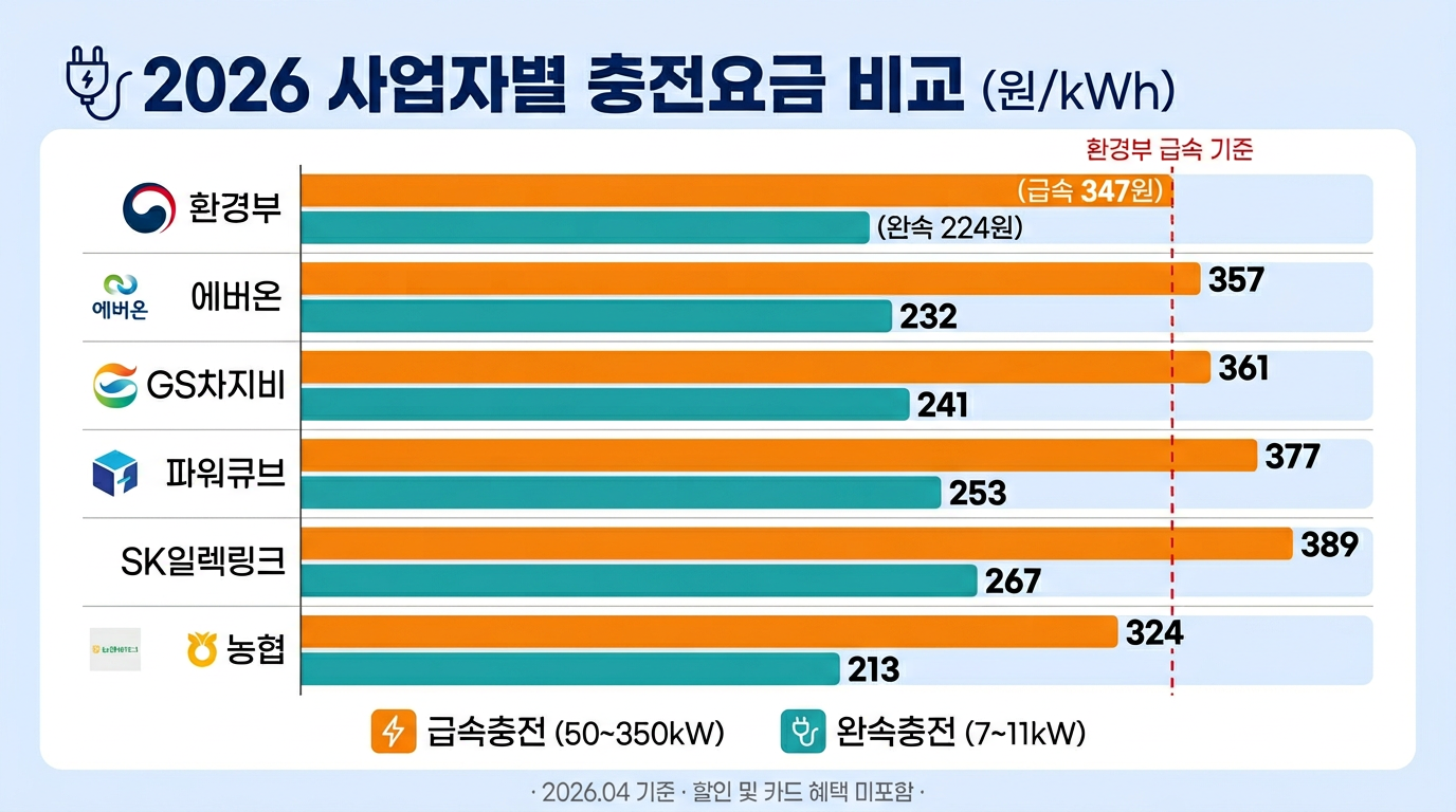 2026년 4월 5일 무공해차 통합누리집 갱신 데이터 기준, 주요 사업자별 회원가를 정리합니다. 비회원은 회원 대비 약 100~160원/kWh 더 비싸므로 반드시 회원 등록 후 이용하는 것이 좋습니다.