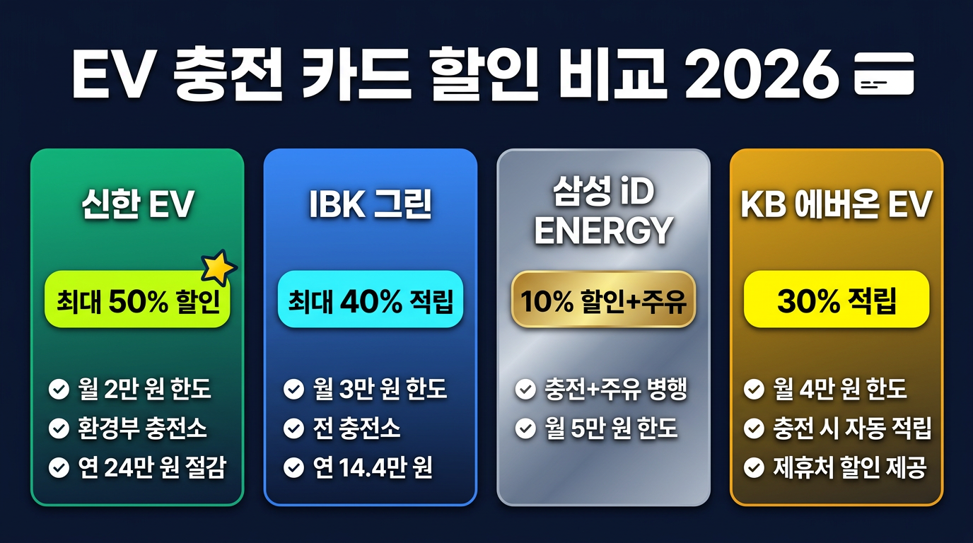 충전 할인율만 보면 신한 EV 카드(최대 50% 할인, 월 한도 2만 원, 연간 최대 24만 원)가 가장 높습니다. 충전+대중교통 포인트 적립을 원하면 IBK 어디로든 그린카드(최대 40%), 주유·하이패스까지 종합 할인을 원하면 삼성 iD ENERGY(10%+주유 1만 원)가 유리합니다.