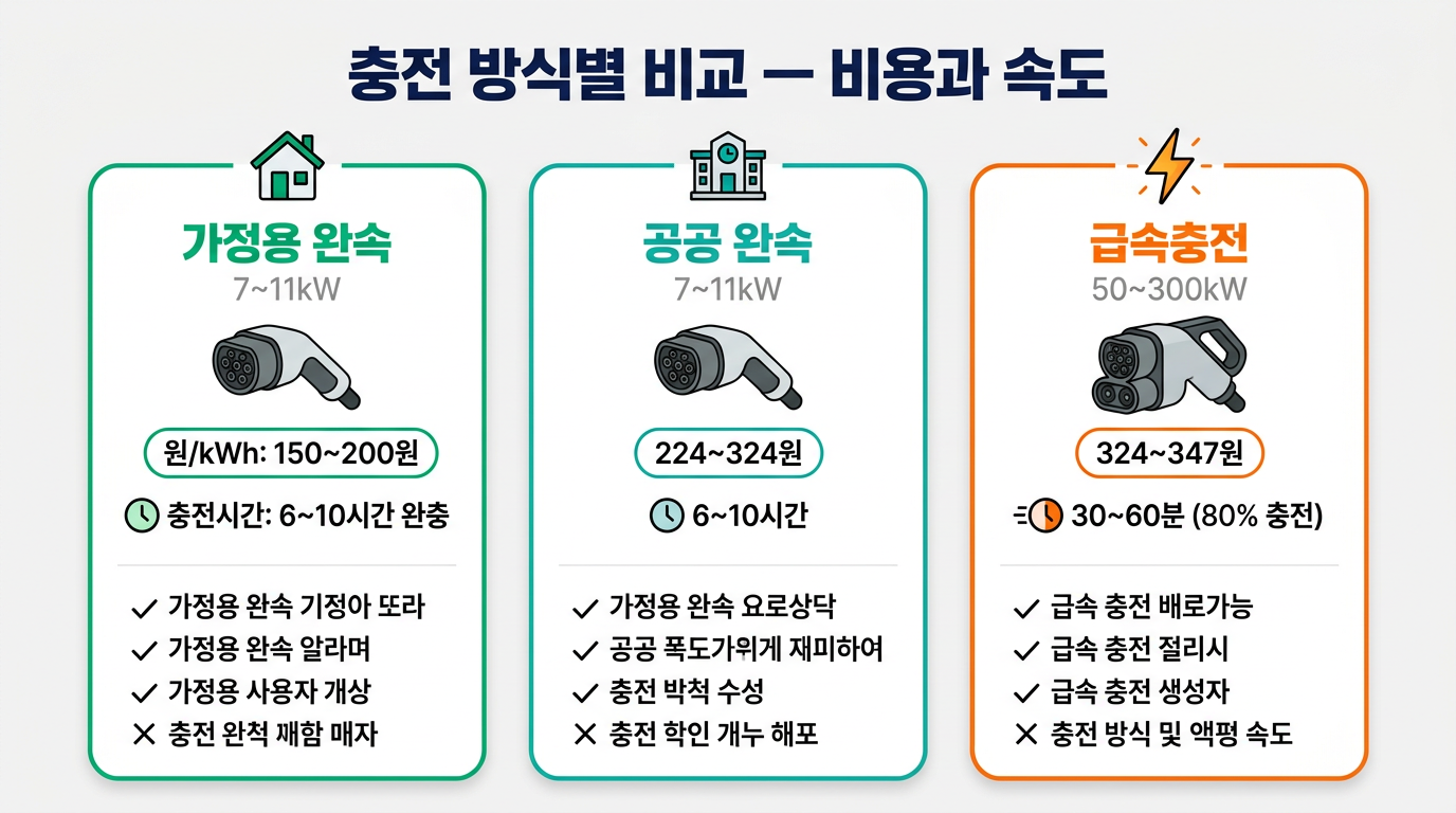 | 장점 | 최저 요금, 심야 할인, 집에서 충전 | 접근성 좋음, 설치 확대 중 | 빠른 충전, 장거리 필수 |