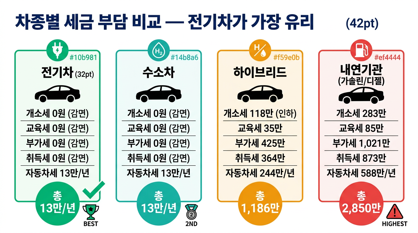 4. 차종별 세금 부담 비교 — 전기차 vs 수소차 vs 하이브리드 vs 내연기관