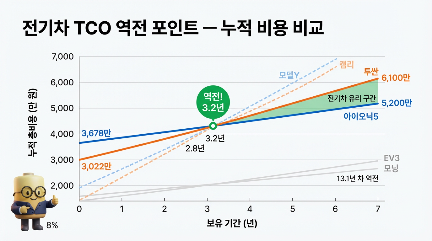 감가를 제외한 순수 운행 비용(충전비+보험+정비+세금+기타)만 놓고 보면, 아이오닉5는 투싼 대비 연간 약 207만 원을 절약합니다. 실 구매비 차이 656만 원을 이 연간 절감액으로 나누면, 약 3.2년 차(3년 2개월)에 구매비 차이를 회수할 수 있습니다. 즉, 3년 이상 보유할 계획이라면 감가를 제외한 순수 비용 측면에서 전기차가 유리해지기 시작합니다.