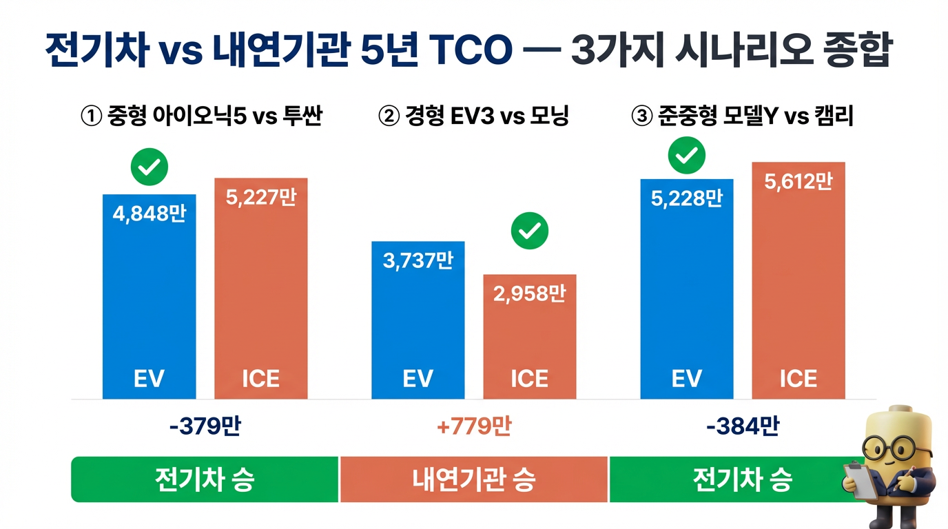 | 시나리오 | 전기차 TCO | 내연기관 TCO | 차이 | 판정 |