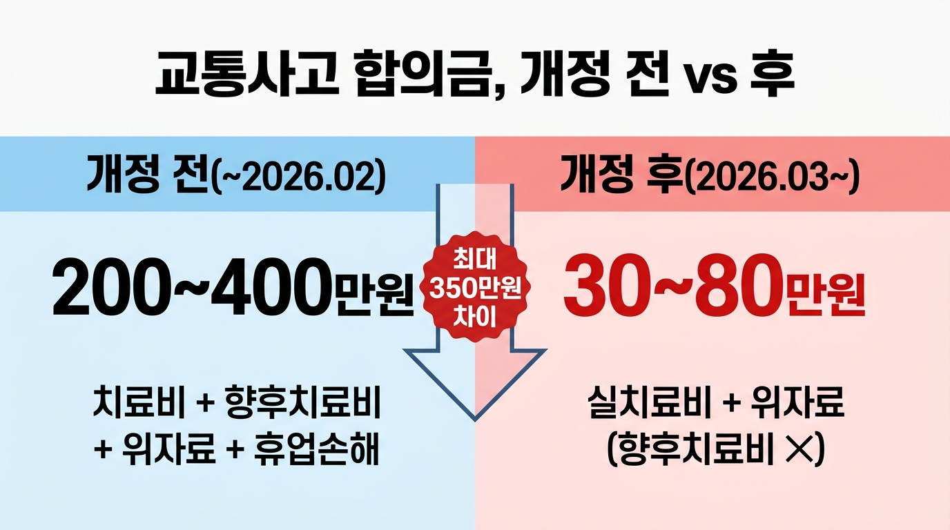 솔직히 저도 작년에 추돌 사고를 당했을 때 "2주 진단에 합의금 200만 원 정도는 기본이지"라고 생각했었거든요. 근데 3월부터는 그 공식이 완전히 깨집니다. 같은 사고를 당해도 합의금이 100만 원 이상 차이가 날 수 있어요.