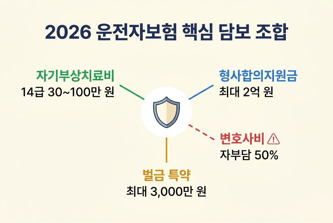① 운전자보험 자기부상치료비 14급 한도 확인. 증권에서 담보별 보장 금액을 찾아 30만 원인지, 100만 원인지 체크합니다. ② 변호사비 특약 자부담 비율 확인. 2026년 1월 이후 갱신된 계약이라면 50 % 자부담이 적용됐을 수 있습니다. ③ 형사합의지원금·벌금 특약 유무 확인. 변호사비 축소를 보완할 핵심 담보입니다. ④ 자동차보험 대인배상 Ⅱ 한도 확인. 무한으로 설정돼 있는지 점검하세요. ⑤ 블랙박스 작동 상태 점검. 영상 증거가 상해등급 판정에 결정적 역할을 합니다.