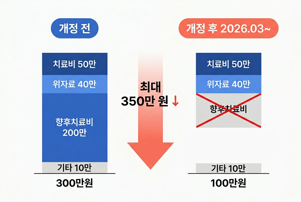 이번 개정으로 향후치료비 지급 대상이 중상해(1~11급)로 한정됩니다. 12~14급 경상환자에게는 원칙적으로 폐지되며, 실제 발생한 치료비와 위자료 중심으로 보상이 재편됩니다.