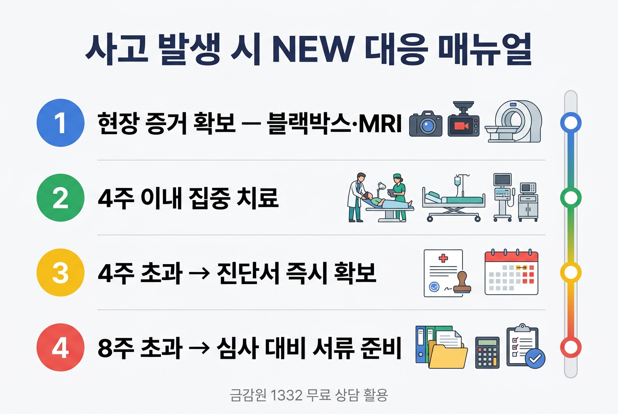 2026년 3월 이후의 보상 환경에서는 사고 초기 대응이 과거보다 훨씬 중요해졌습니다. 아래 4단계를 기억해 두세요.