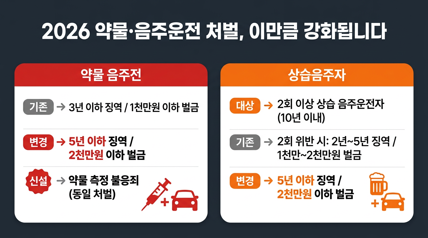2026년 4월부터 약물운전 처벌 기준이 '3년 이하 징역 또는 1천만원 이하 벌금'에서 '5년 이하 징역 또는 2천만원 이하 벌금'으로 상향됩니다. 특히 '약물 측정 불응죄'가 신설되어, 경찰의 측정 요구를 거부하면 약물운전과 동일한 처벌을 받게 됩니다. 감기약·수면제 등 일반 약품도 '정상적 운전이 어려운 상태'로 판단되면 처벌 대상이 되므로 각별한 주의가 필요합니다.