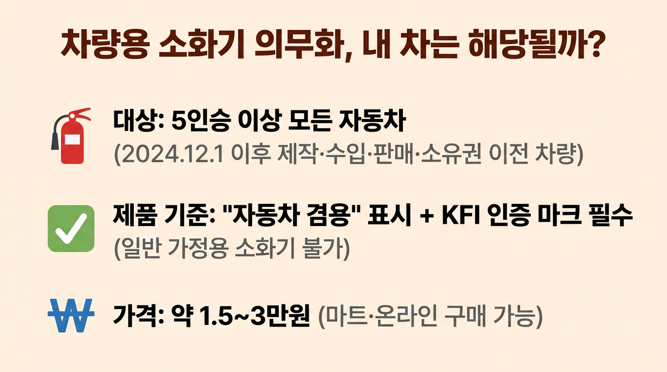 2024년 12월 1일부터 시행된 소방시설법 개정에 따라, 5인승 이상 차량에 차량용 소화기 설치·비치가 의무화되었습니다. 대상은 시행일 이후 제작·수입·판매되거나 소유권이 이전된 차량이며, 기존 등록 차량은 의무 대상은 아닙니다. 다만 2026년부터 자동차 정기검사 시 소화기 비치 여부가 확인 항목에 포함되므로 사실상 모든 차량에 영향을 미치게 됩니다. 반드시 '자동차 겸용' 표시와 KFI 인증 마크가 있는 제품(약 1.5~3만원)을 비치해야 하며, 미비치 시 최대 3년 징역 또는 3,000만원 벌금에 처할 수 있습니다.